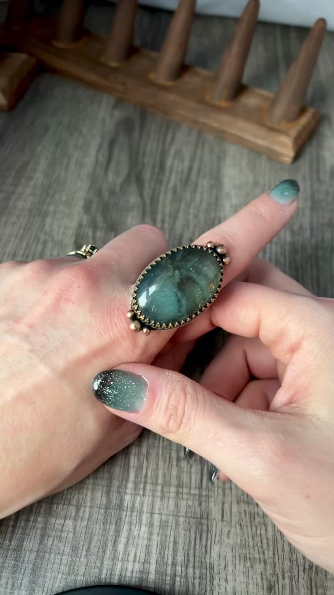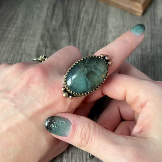 A Large, Lovely 25x37mm Labradorite Sterling Silver Statement Ring with Yellow Brass detailed gallery bezel and accent balls. Size 8 1/4. Labradorite is a magical stone that guides you on a journey of self-discovery, unlocking your true essence. With its connection to the cosmos, it strengthens your trust in the abundant Universe and increases awareness of synchronicity. Its vibrant energy harmonizes the chakras, allowing for transformation and overcoming insecurities. As it reflects the stunning colors of the Aurora Borealis, Labradorite embraces both light and darkness within, revealing the beauty and power within. It builds resilience and instills confidence to stand up to those who try to dim your light. Additionally, it opens the inner eye and enhances psychic vision, elevating the mind to a higher consciousness. This stone also serves as a protective barrier against negative energies and facilitates spiritual healing through shamanic journeys to other worlds and past lives.
