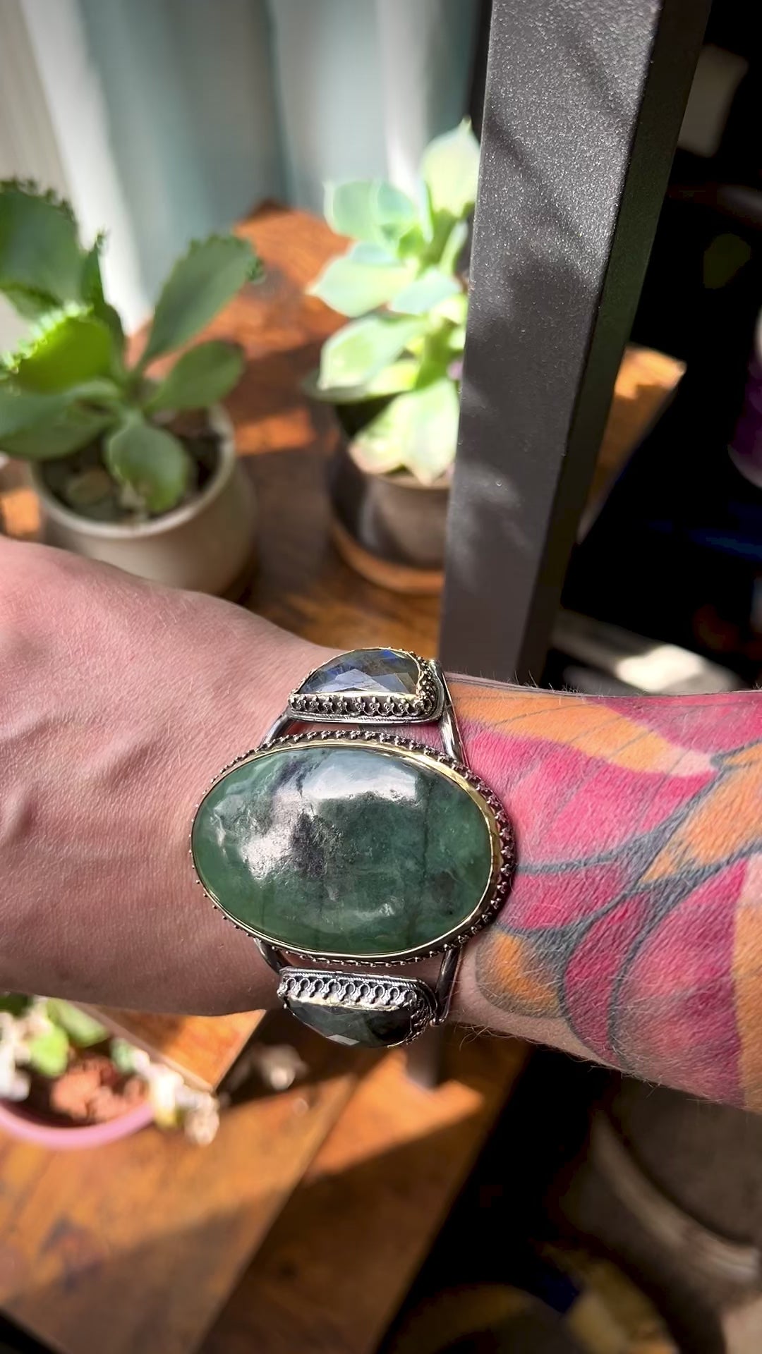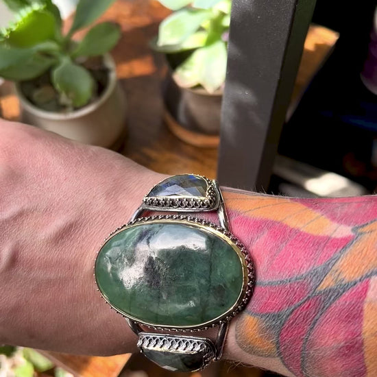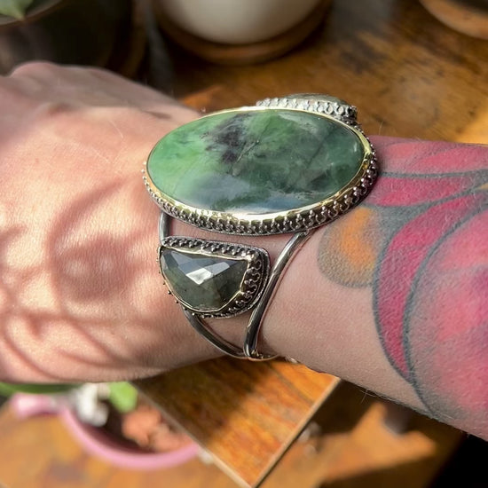 Labradorite Bold Witchy Sterling Silver Cuff Bracelet with Green Stones