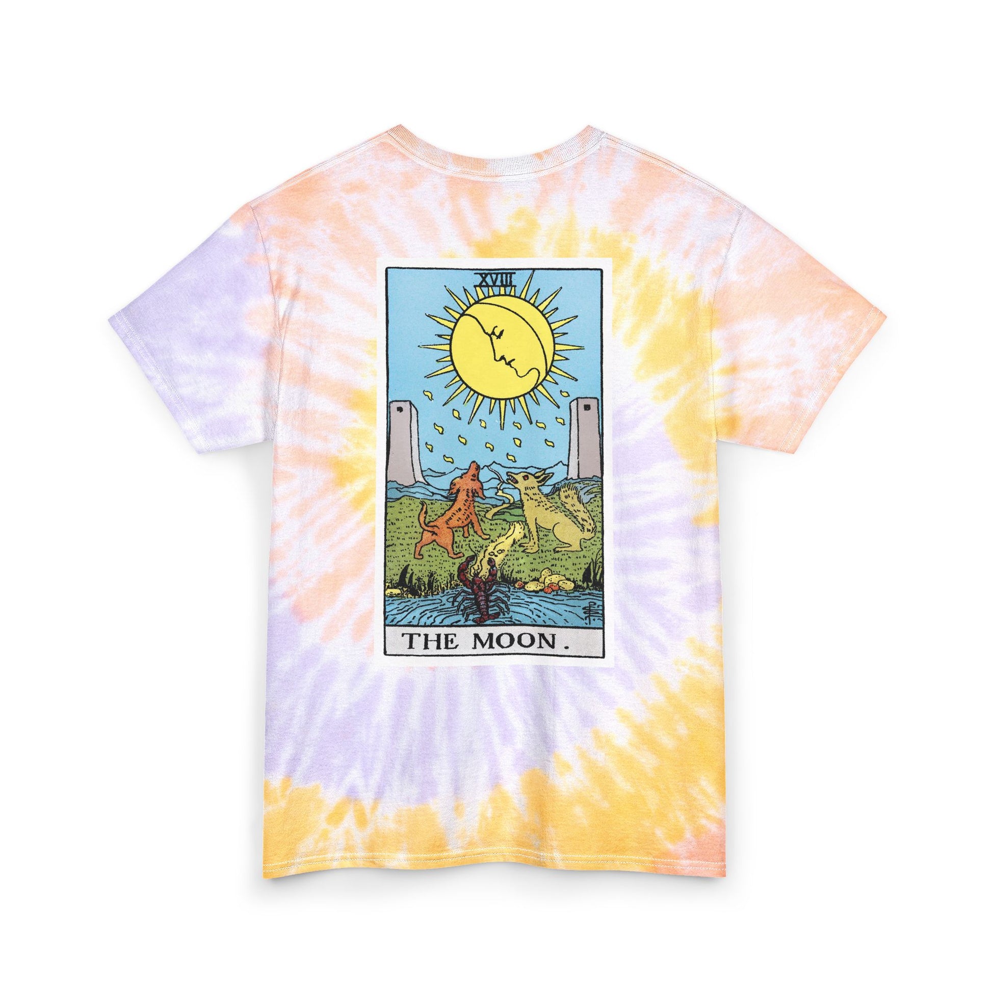 This tie-dye tee carries an old-world tarot vibe — sun on the front, moon on the back — for people who live between daylight and starlight. The design draws from the iconic Rider Waite Smith tarot tradition, featuring the radiant Sun card's golden warmth and the mystical Moon card's ethereal glow. These timeless arcana symbols have guided seekers for generations, and now they're woven into wearable art that honors both celestial magic and personal reflection. The soft, midweight ring-spun cotton drapes easily, so the card illustrations feel like wearable snapshots from a personal journey. Each shirt's swirl is unique, giving every piece a slightly different halo around the vivid tarot panels. Wear it to anchor a ritual, to a music night, or on slow afternoons when you want clothing that reads like a quiet declaration of curiosity and meaning.