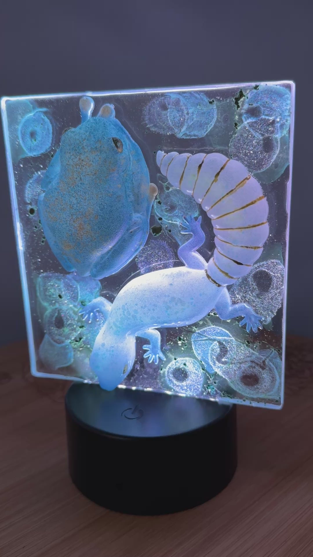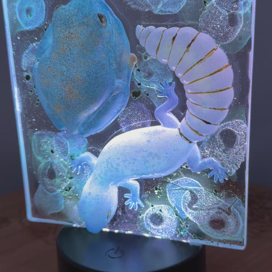 Illuminate your space with this enchanting glowing gecko and tree frog nightlight, featuring mesmerizing iridescent blue-green and gold hues that create a magical ambiance.