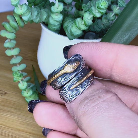 This unique and playful wide sterling silver adjustable wrap ring features charming brass animal and insect accents. You can choose from a variety of options, including whimsical animals and delicate flowers. With its intricate floral patterned wire and adjustable design, it's the perfect statement piece for any outfit.